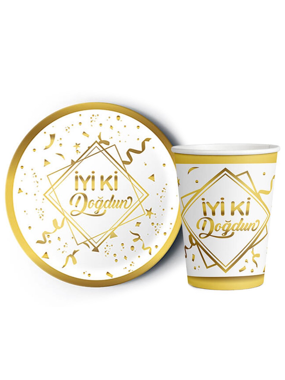 8'li Karton Tabak - Bardak Yaldızlı İyi ki Doğdun Beyaz - Altın Yaldız