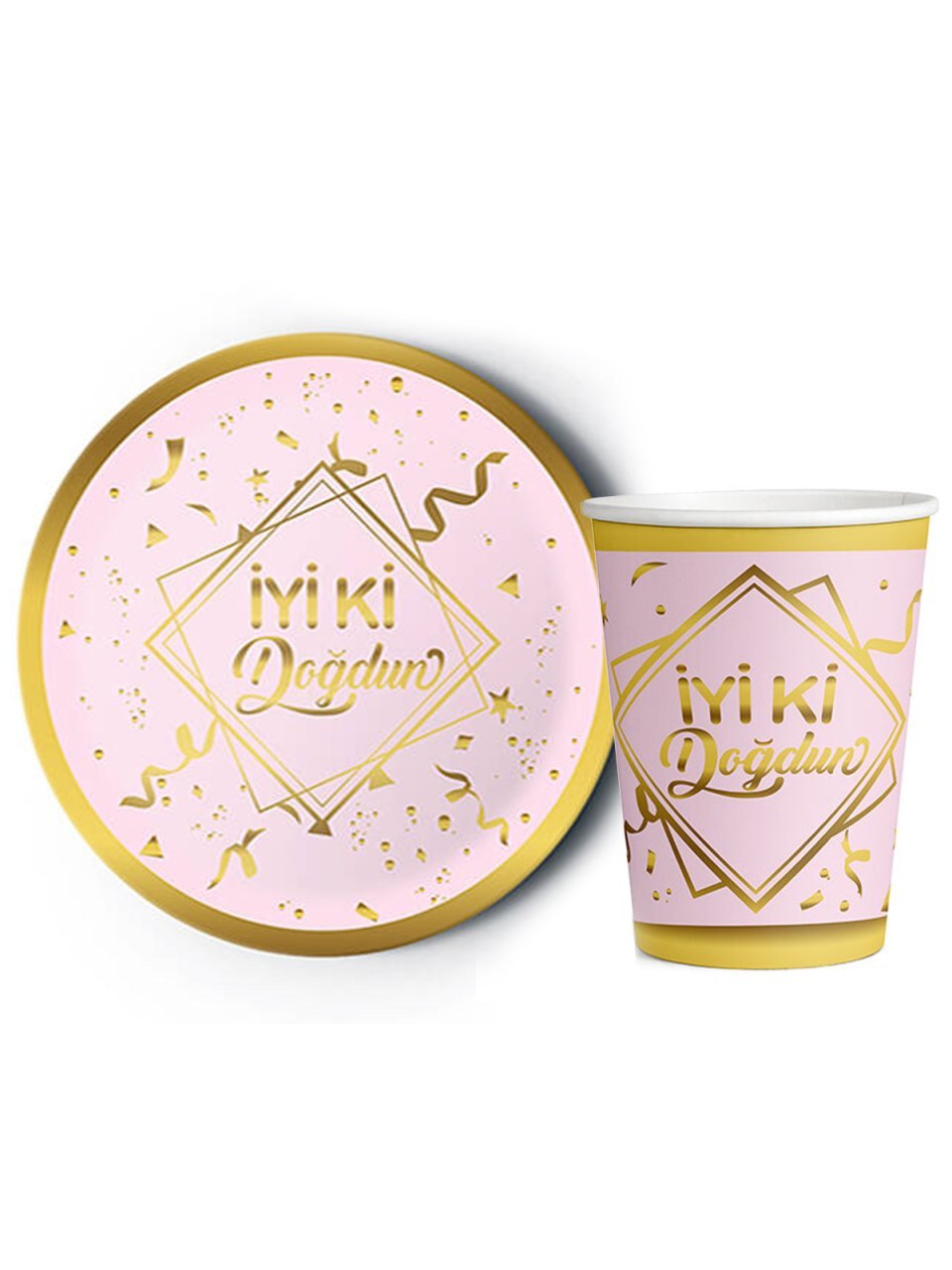 8'li Karton Tabak - Bardak Yaldızlı İyi ki Doğdun Pembe - Altın Yaldız