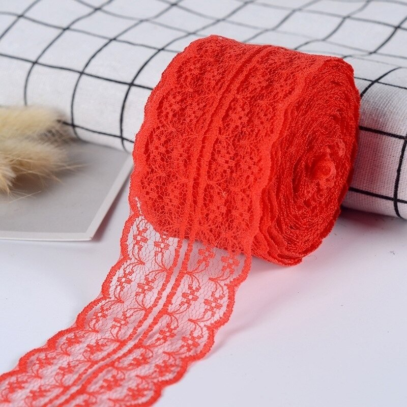 İsterseniz ikramlıklarınızı paketlemek, isterseniz özel günlerinizi anımsatacak minik hediyeleri süslemek için tercih edebileceğiniz kırmızı renkli dantel kurdele modelimiz 5 cm x 10 metre ölçülerindedir.